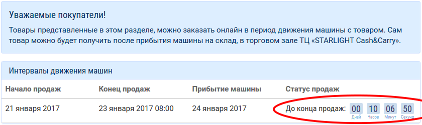 Обратите внимание на информационный блок «Интервалы движения машин» над списком товаров. В нем приведена актуальная информация по текущей поставке: Начало продаж, Конец продаж, Прибытие машины (в Москву), Статус: Оставшееся время до конца продаж.