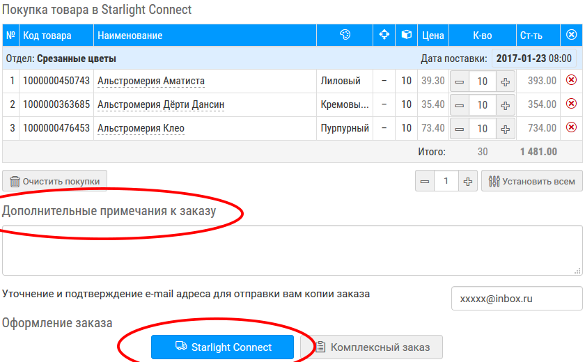 Вы выбрали все товары и переходите в корзину. Здесь все как обычно, можно откорректировать количество покупаемого товара или какие-то позиции удалить из списка. При необходимости пишете примечание к заказу и нажимаете кнопку «Starlight Connect».