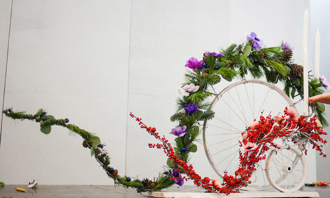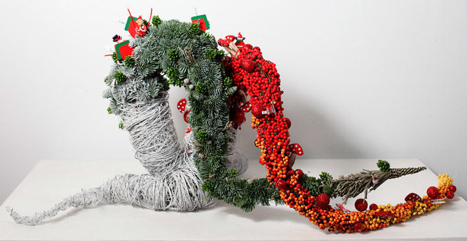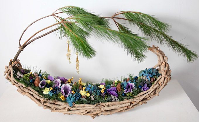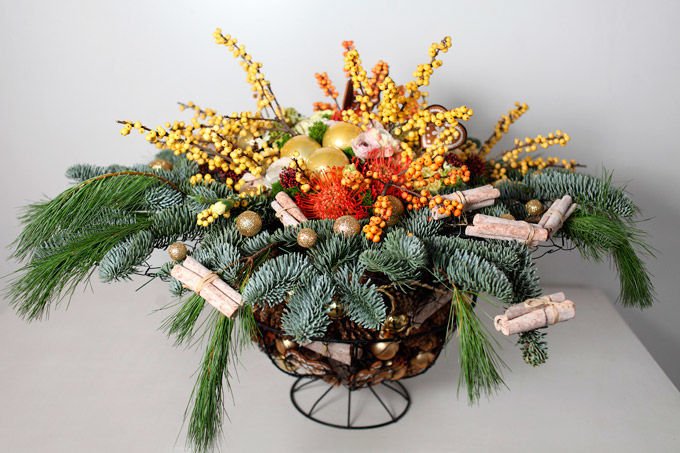В основе этой композиции проволочный каркас, который Виталий доработал таким образом, чтобы вся композиция по силуэту напоминала рождественский мешок с подарками. Окаймление хвойным плюмажем из пинуса и абиес нобилиса «добавляет» игривое настроение за счёт вольной формы края. В роли праздничных аксессуаров использованы все традиционные атрибуты рождества: декоративные прянички на деревянных штекерах, связки корицы, шишки и золотистые новогодние шарики. Ветви Илекса сорта Цитронела задают золотистую гамму, которую поддерживают гвоздики в золотисто-лимонном оттенке. И, словно лёгкий морозный узор, в  композиции появляются итальянские ранункулусы светлых оттенков.