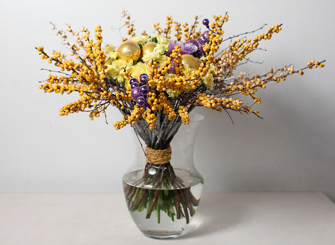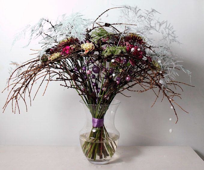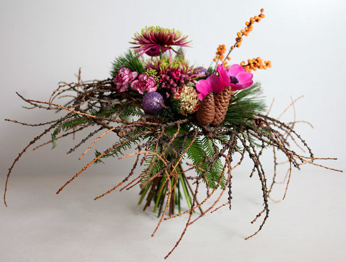 Необычный каркас этого букета подчёркивает рисунок ветвей, украшенных новогодними шариками. Презентовать такую вещь можно на публике. Благодаря форме, вторящей силуэту дуги лука со стрелами, и сдержанной цветовой гамме, букет идеален для того, чтобы преподнести его мужчине.