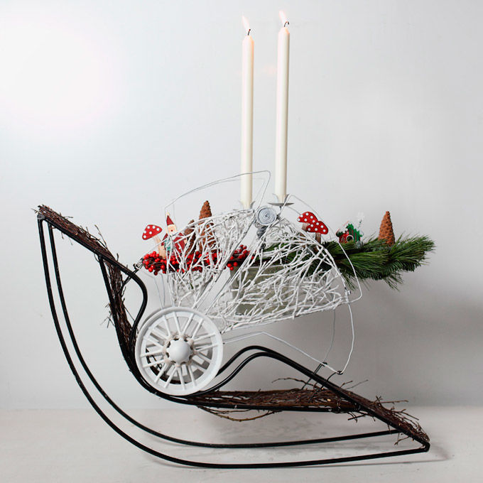 Авторская композиция. Флористическая часть балансирует благодаря противовесу, поэтому свечи всегда остаются в вертикальном положении. Конструкция сварена. Лопасти заполнены берёзовыми ветвями натурального и белого цветов.В зависимости от угла наклона конструкции из за «ширмы» появляется либо красный фрагмент с ягодами Илекса, либо зелёный с пинусом.