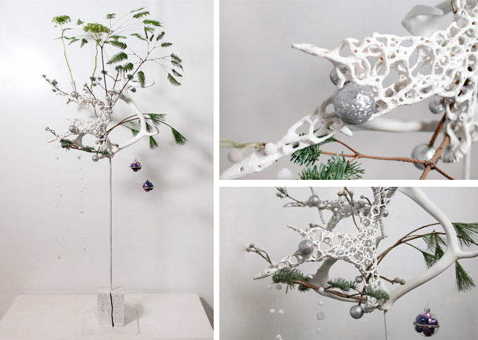 Новогодние вьюги. Каркас из проволоки, выкрашенной в белый цвет. Из центра воронки на проволочную основу, укреплённую гибкими ветвями, с помощью проволоки «накручиваются» остатки нобилиса разного размера с тенденцией к уменьшению. Изящная линия завершается конусом, оформленным изумрудно-золотистым декоративным шнуром.