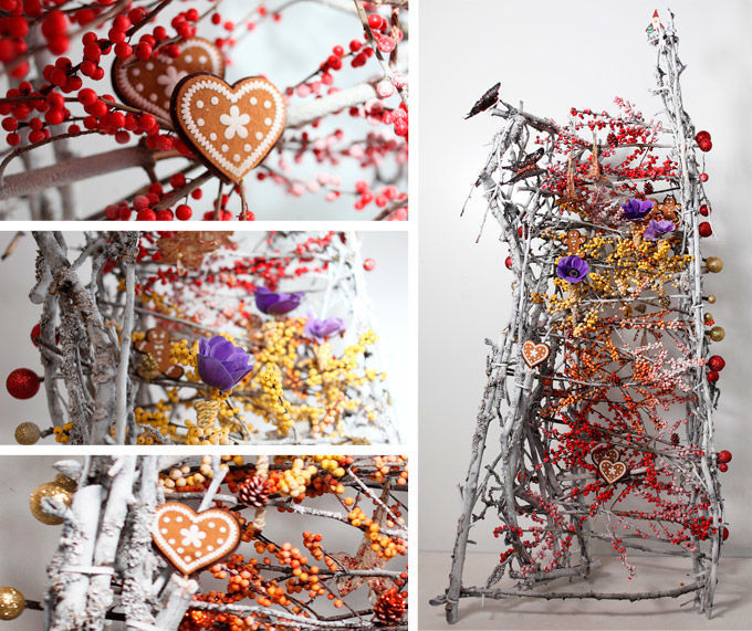 Аллегория на тему сказочного леса. Напольная или витринная композиция, которая отлично будет работать в велком-зоне гостиницы, на ресепшн ресторана или в окне флористического магазина. Две планки основы (из выкрашенных в белый цвет ветвей яблони) скреплены с помощью побегов илекса трёх сортов (Цитронелла, Голден Вербум, Ред Бес).  Все срезы илекса закрыты новогодними шариками в блёстках красного, оранжевого и золотистого цветов. Такие шарики можно найти на нашем сайте в разделе Новогодняя коллекция. Декоративные бабочки на прищепке, пряничные сердечки и сказочные новогодние подвески в форме цветов бронзового цвета создают совершенно сказочную атмосферу.