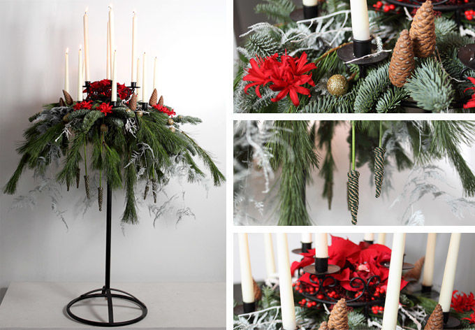 Использовались: Пуансеттия, Нерине Lydia, Аспарагус Плюмозус краш, Пинус, Абиес Нобилис, набор свечей.