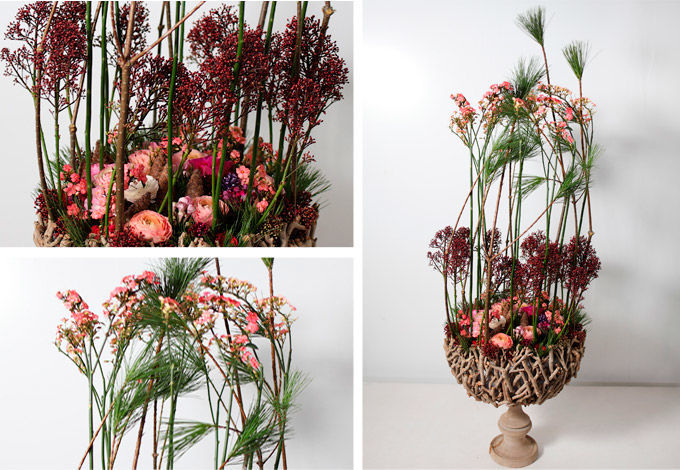 В золотой корзине настроение задаёт притягательная анемона сорта Мона Лиза Ред, которая использовалась в ансамбле со скимией сорта Рубела, илексом, пинусом и нерине. Заданную цветовую гамму дополняют ранункулусы Клуни Супер Блэк