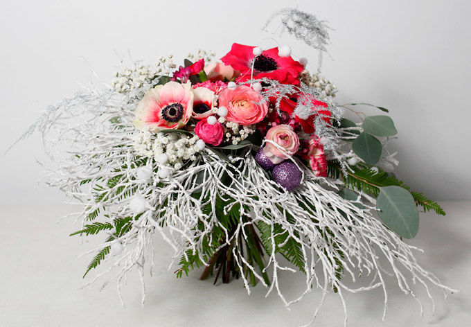 Букет – олицетворение русской зимы, словно сошедший с живописных жёстовских подносов. Анемоны и ранункулусы хороши в каркасных букетах ещё и потому, что когда у сорта диаметр цветка очень велик, поддерживаемый каркасом он сохраняет форму и большие выразительные лепестки не травмируются соседними цветами.