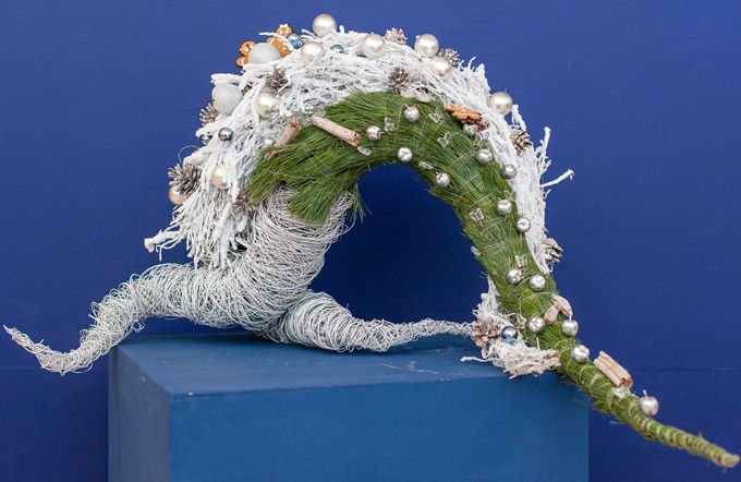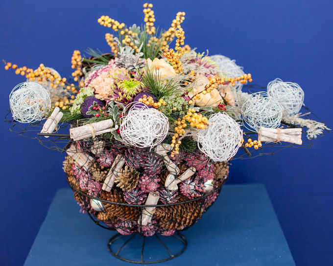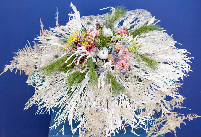 На грандиозном по размеру каркасе из крашеных ветвей черничника, с воздушными веточками аспарарагуса Плюмозус и декоративными серебристыми кленовыми листьями расположились серые шарики Брунии Левис, крупные цветы Хризантемы Бальтазар, Ранункулус Клуни Рафаэлло Супер (Ит) оттенок узорчатого края которого поддерживает основную гамму хризантемы, колкий Пинус и Эрингиум. Новогодние шарики сдержанного голубого цвета гармонируют с размером и цветом эрингиума.