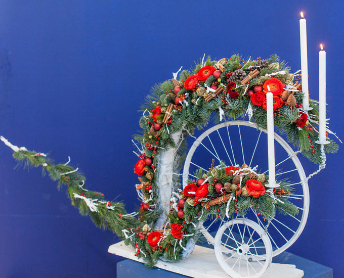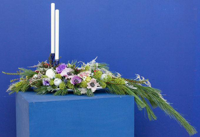 Традиционная по цветовой гамме и использованию материалов рождественская композиция воспринимается совершенно иначе благодаря оригинальной форме авторской конструкции подсвечника. Использовались: Два сорта ранункулуса (Ранункулус Клуни Супер Ред, Ранункулус Клуни Танго, бутоны ранункулуса Клуни Супер Крем), илекс, абиес нобилис, пинус, крашеный черничник.