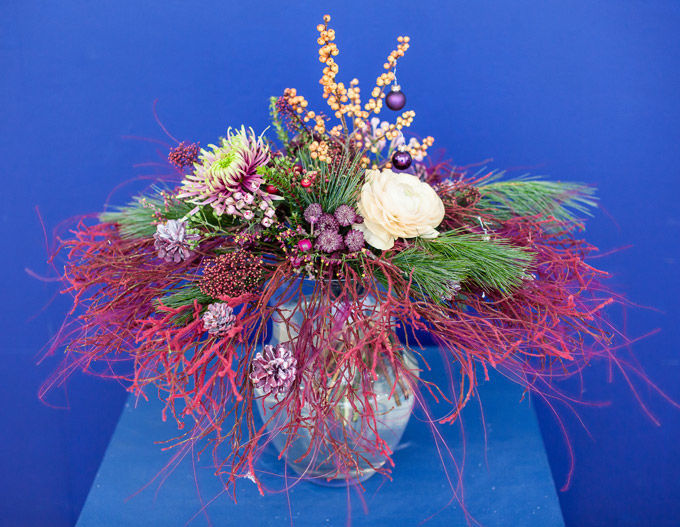 Более лёгким по восприятию каркас этого букета делают пластичные линии ковыля. Винные нотки цветовой гаммы каркаса перекликаются с похожими по цвету вкраплениями на ягодах Илекса Кресголд, соцветиями скимии сорта Рубелла и астрантии Рим. Новогоднее настроение появляется благодаря использованию незначительного количества веточек Пинуса.