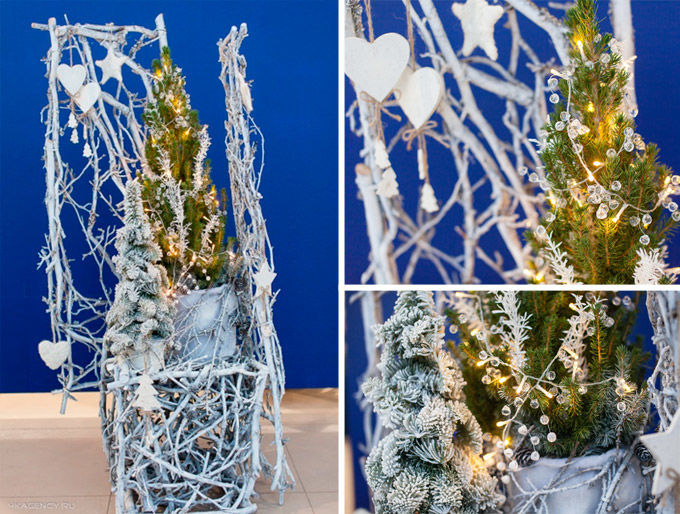Представить сезонные горшечные и аксессуары можно разными способами. Фрагмент новогодней витрины во флористическом магазине.