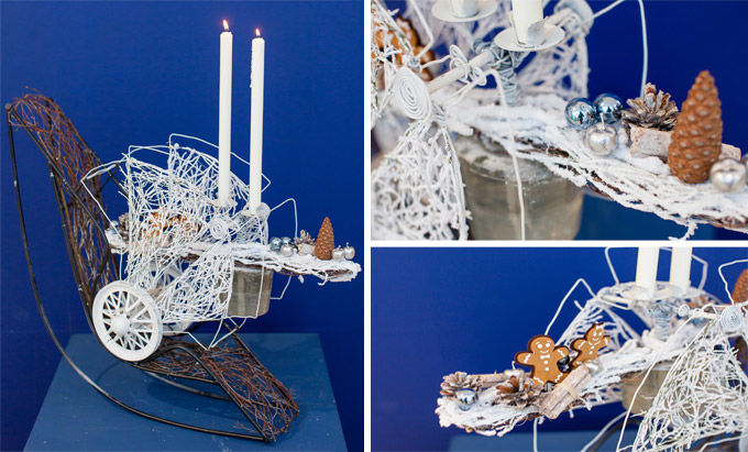 Ещё одна вариация композиции «Качели». Балансирующая часть подсвечника решена в единой гамме. Новогодние шарики, серебристые декоративные яблочки и шишки закреплены на основе, задекорированной крашеным черничником. Так как в композиции не использованы живые нежные цветы, она не побоится холодного пространства холла и может быть использована для оформления зоны входа. В этом случае, конечно, свечи можно будет погасить.